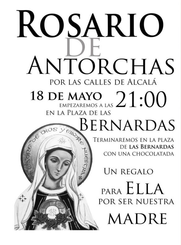Las Hermanas del Hogar de la Madre nos invitan a todos a participar en el Rosario de Antorchas este sábado a las 21.00h, saldremos desde la Plaza de las Bernardas. A nuestra Parroquia de Santa Teresa le corresponde el tercer misterio, y se necesitan voluntarios para llevar las andas.