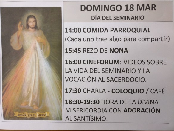 Como ya os informamos en esta entrada, este domingo, a partir de la hora de comer, vamos a compartir una jornada de convivencia en la parroquia entre todos aquellos que se acerquen: comida, cine-forum, oración y adoración.