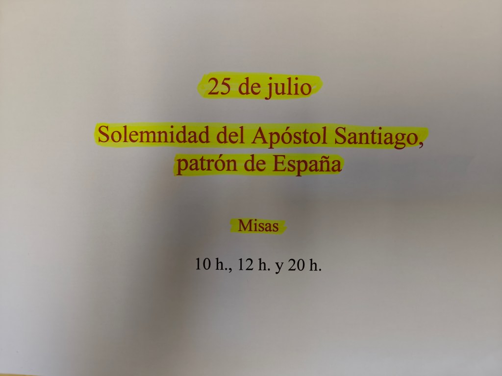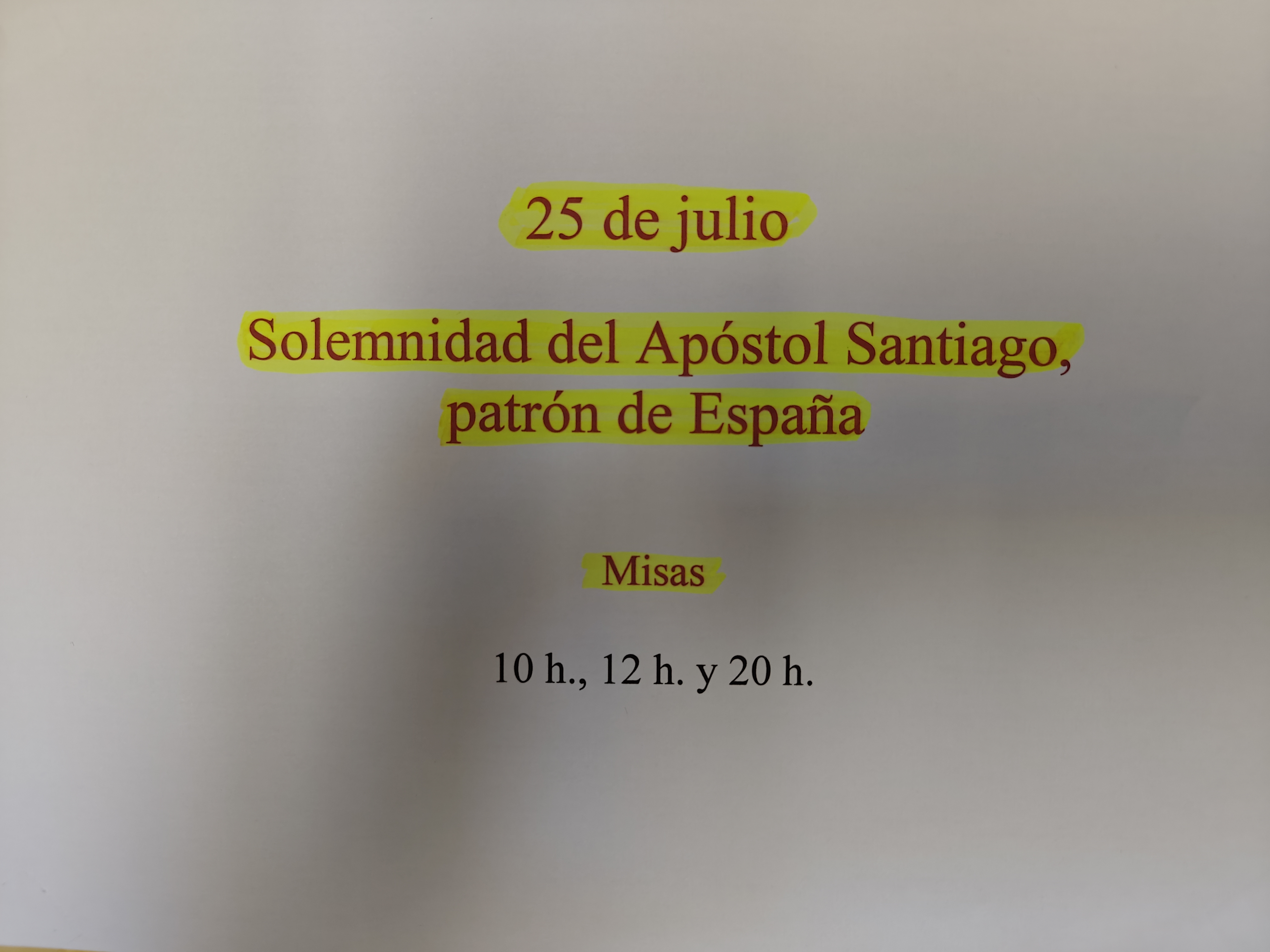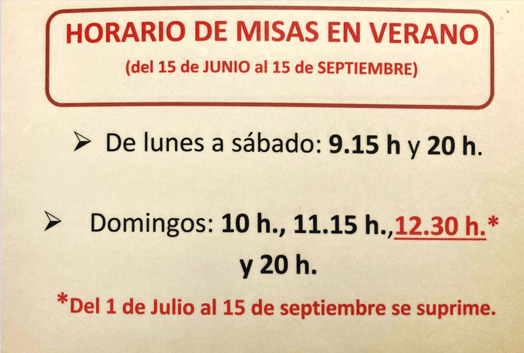A partir del 1 de Julio y hasta el 15 de Septiembre, se suprime la misa de 12.30 de los Domingos, quedando 10.00h, 11.15h y 20.00h.