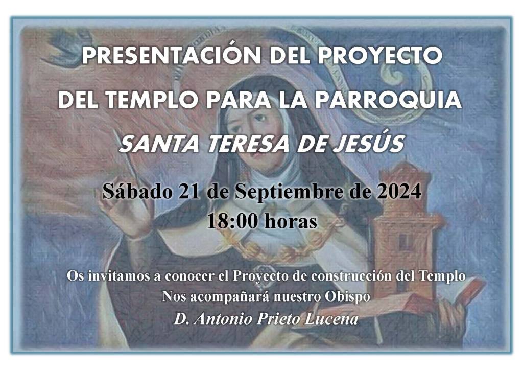 Nos llena de alegría anunciar que el próximo día 21 de Septiembre a las 18.00 será un momento histórico para nuestra comunidad: la presentación oficial del proyecto de construcción de nuestra nueva parroquia. Este emocionante evento contará con la presencia de nuestro querido obispo D. Antonio Prieto, quien bendecirá este importante paso en nuestra misión de glorificar a Dios y servir a nuestros vecinos con un espacio renovado y acogedor.